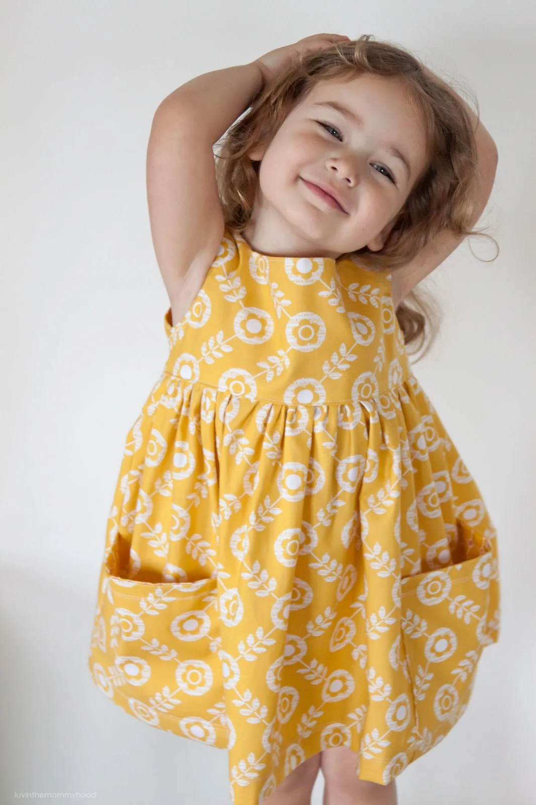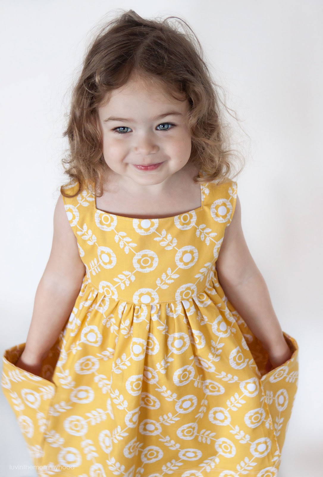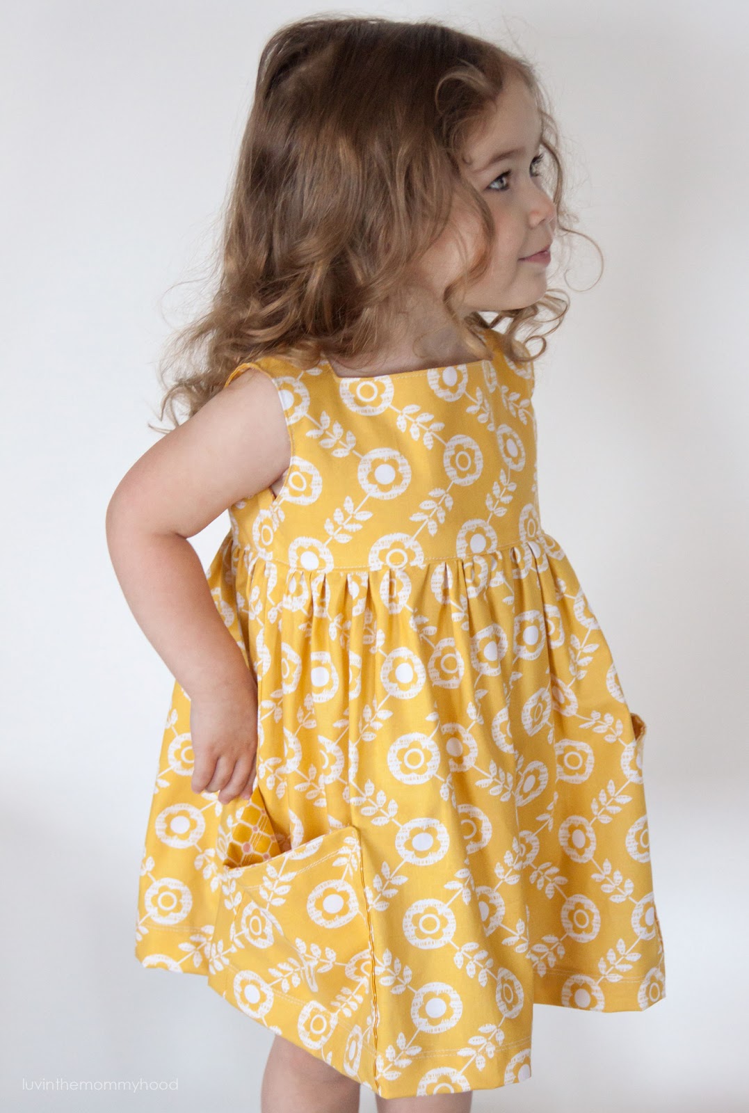 i also knew when designing this dress that simplicity was my goal. i wanted no closures - thus the square neckline. and yes, that's right - there is no zipper or buttons. you just pull it on. love it! and so does she! the bodice is fully lined as are the pockets. the pockets also go right down into the hem for optimum toy storage! i also knew i wanted a higher waistline, gathered skirt and a shorter length than normal. it's hard to tell from these pics but she could easily wear this as a tunic. i might have even gone a bit shorter if she had stood still longer for me to pin more accurately. darn 3 year olds...lol...don't they want mommy to make them stand on a stool wearing a piece of fabric with pins for 10 minutes while i measure over and over again? no way. she's a trooper though. she's getting there.
