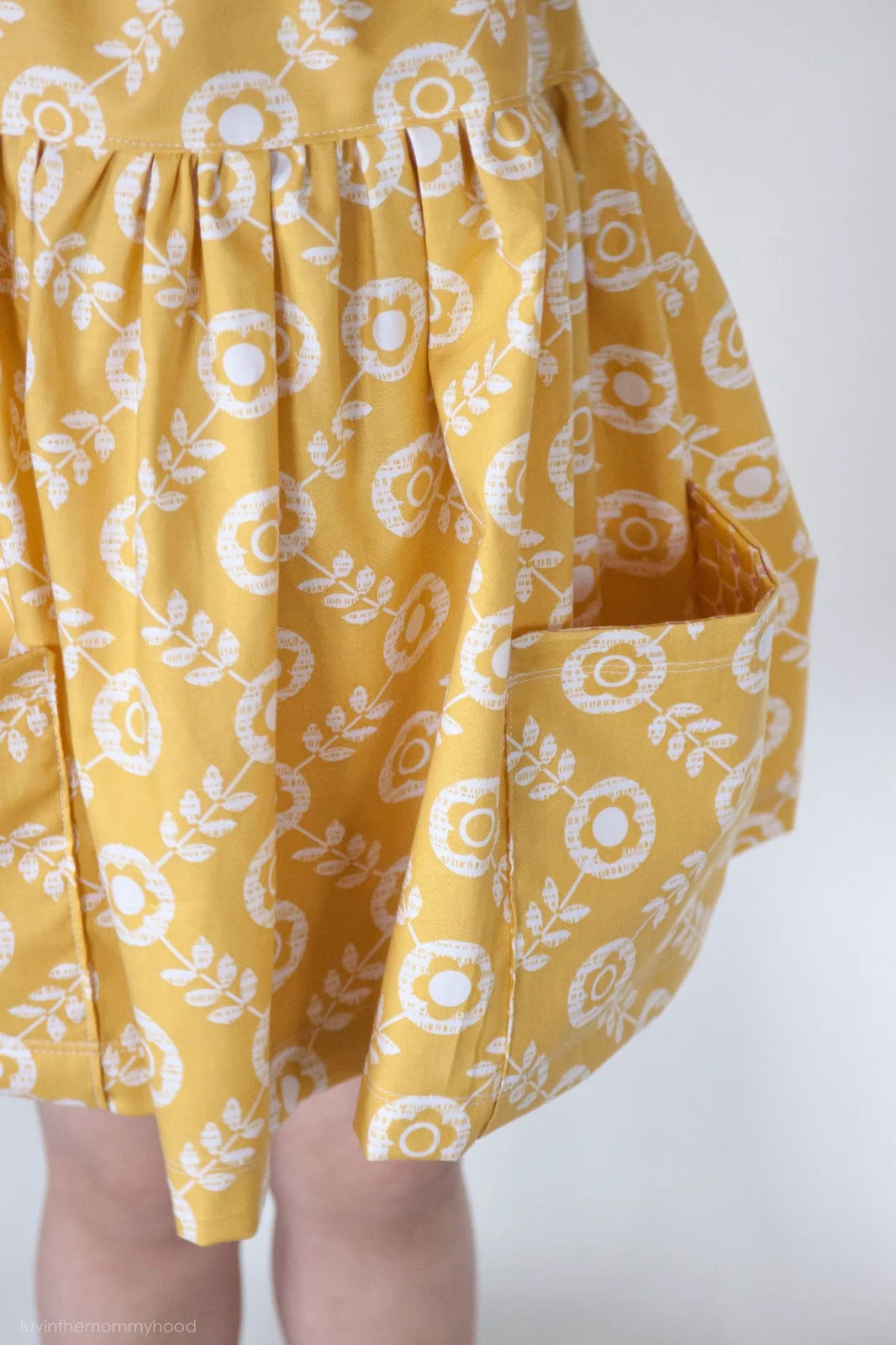 the print i decided to use definitely reminded me of my inspiration - sally draper of the tv show mad men. i looove mad men and i love the clothing from the show. i thought it would be fun to use sally as my jumping off point. can't you just see her in a scene wearing this cute frock? the fabric i used is floradots in saffron by erin mcmorris for free spirit. i also have some in a blue/grey tone that i hope to use to sew my oldest a sally dress as well with some fun add ons. the bodice and pockets were then lined with hidden treasure gold from indie by pat bravo for art gallery fabrics. such a great print too!