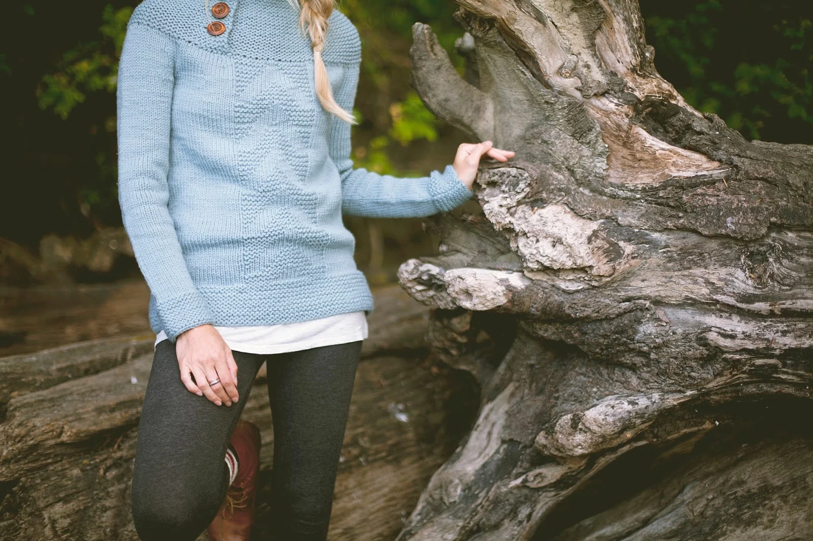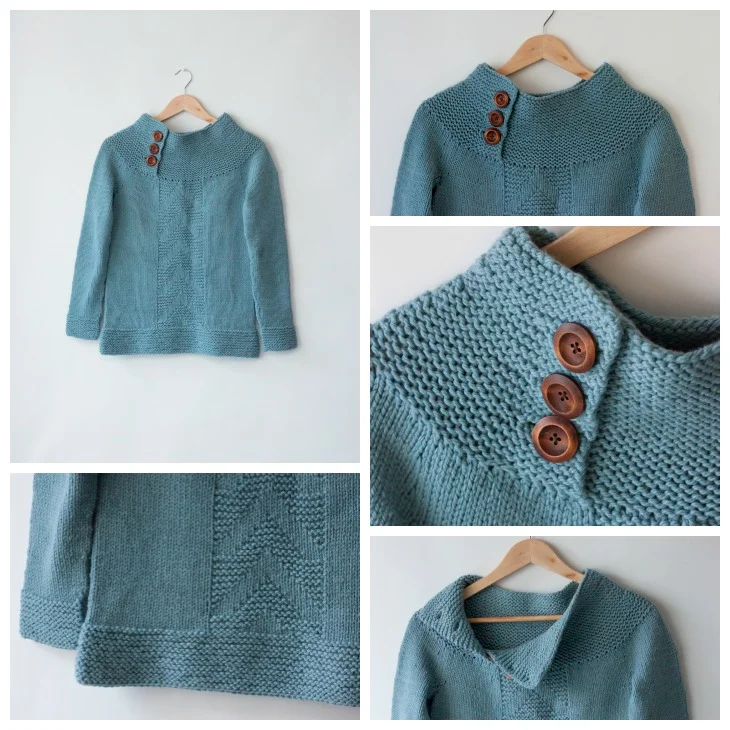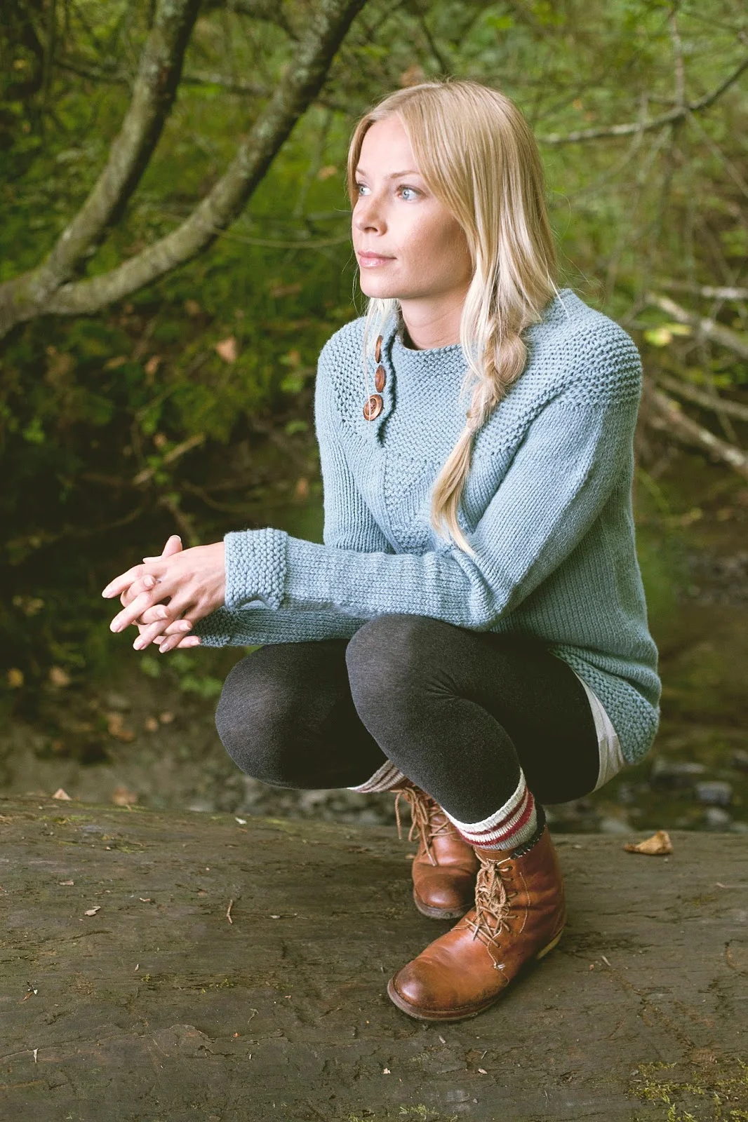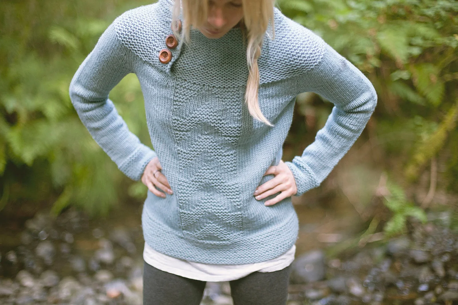 The funnel is knit flat and then joined in the round and the rest of the pullover is knit top down. The sweater is designed with 2in of positive ease and is meant to be worn semi-fitted so it's perfect for layering! Pair with your fave top/tank underneath or over your new go-to dress with leggings and boots for fall.