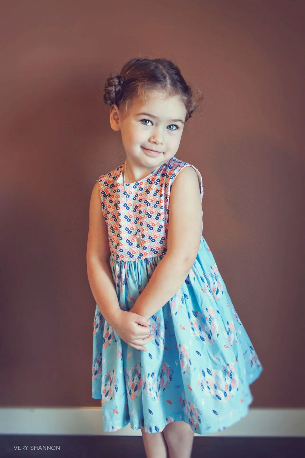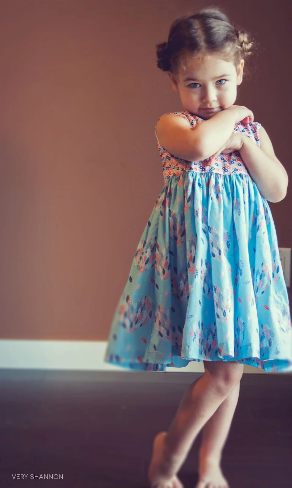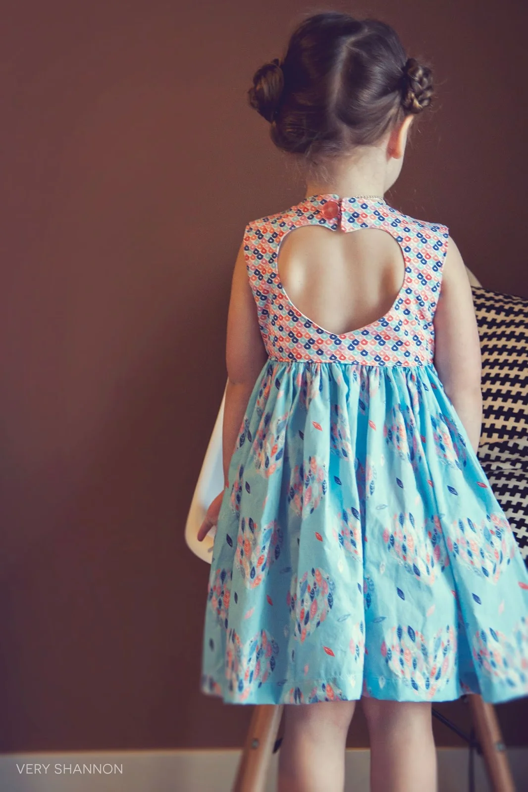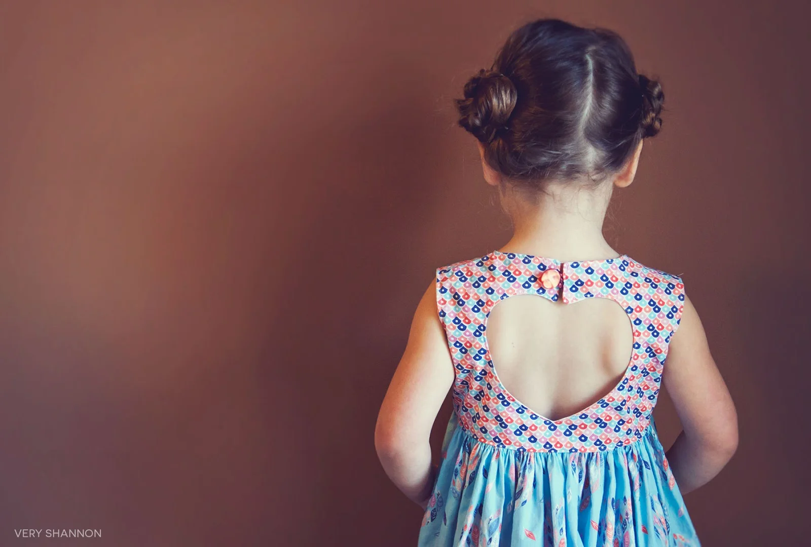 My little girl is wearing a size 3T bodice with a size 4 skirt. Only modification I made to our Sweetheart Dress Pattern was to use the full width of the yardage for the skirt for extra twirl factor! She loooooves that! She's really into ballet and dance and I think this is her favorite dress we've made her yet! She wouldn't take it off. You can read more about the Sweetheart Dress Pattern and purchase it from our shop HERE.