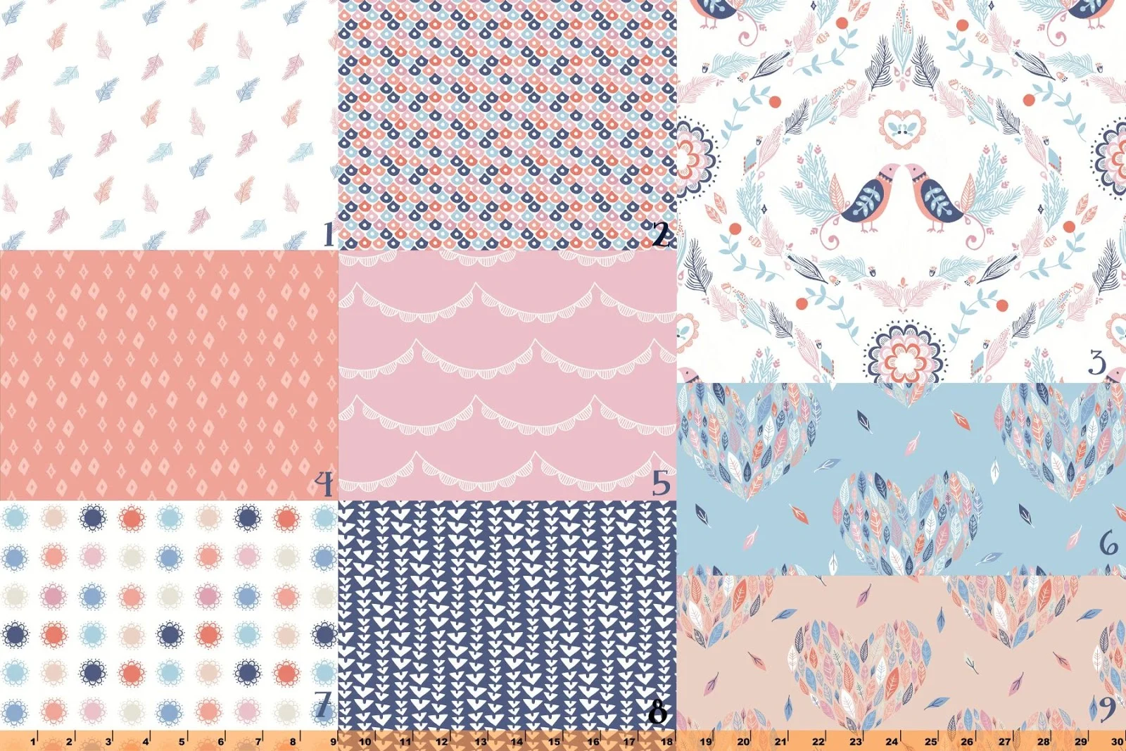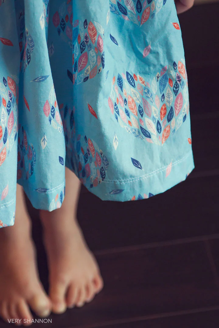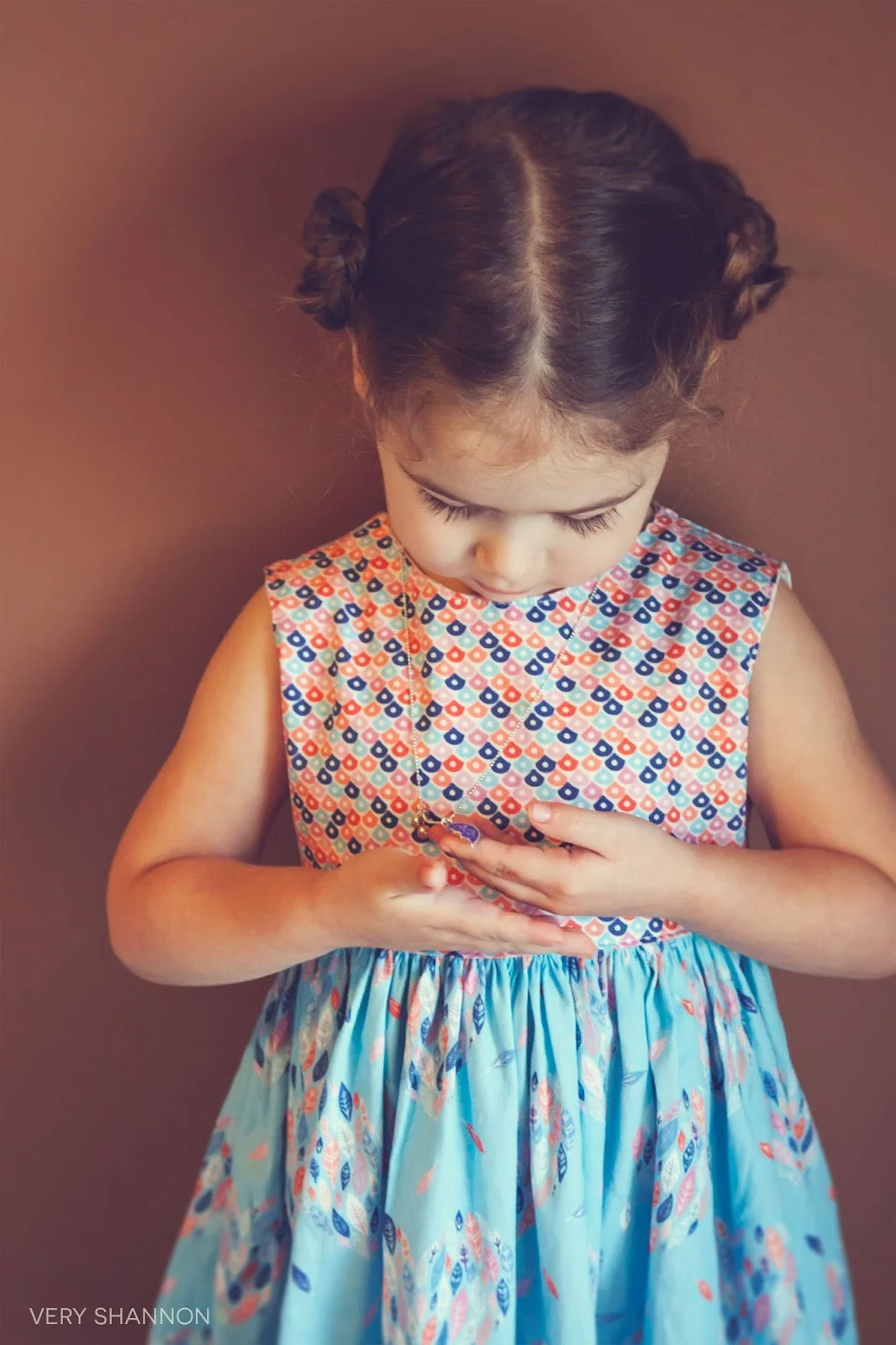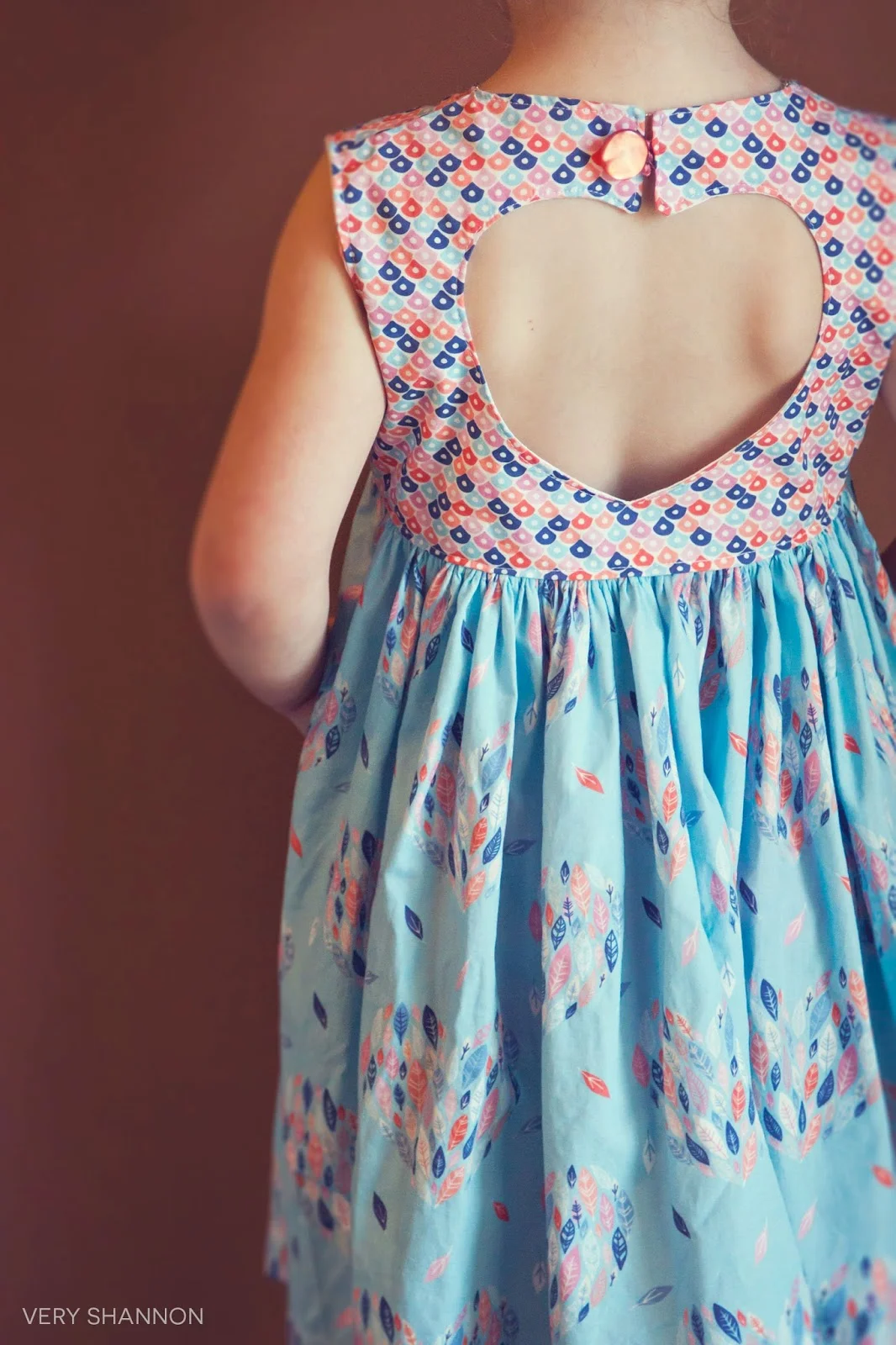 We couldn't resist making a Sweetheart Dress when we saw the prints in Calliope! Hearts + feathers = yes please! I was more than happy to sew up our pattern with the print Feathered Hearts in Bluebell (shown on the skirt) along with the equally adorable print "Jubilee in White" for the bodice. And well you can't see it here we used "Poetic Plumes in White" for the bodice lining and it's gosh darn pretty too!
