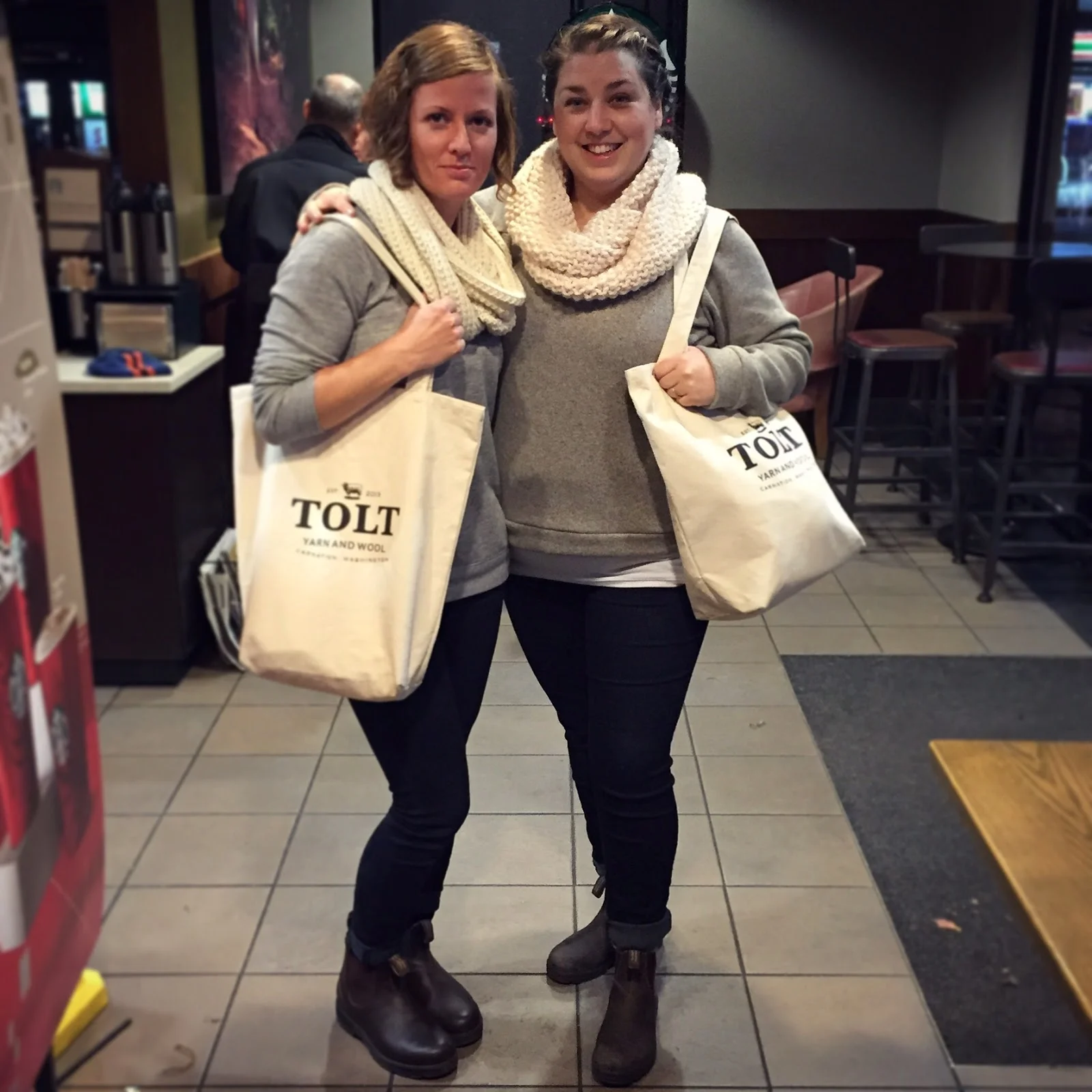 **And just as a funny bonus if you follow me on Instagram you may have seen the other week a pretty funny predicament. I was meeting up with the girls for some knitting at a nearby Starbucks (and we swear we never discussed it beforehand) Jane and I showed up in literally the same outfit! Only difference was her sweatshirt is bought and mine was handmade (the Linden). Ummm...can we say great minds think alike? No wonder we're best friends...lol. We both have our Tolt Bags on, white cowls, same exact jeans, our blundstones...etc...I'm still laughing. Heck the staff at Starbucks was even making fun of us!