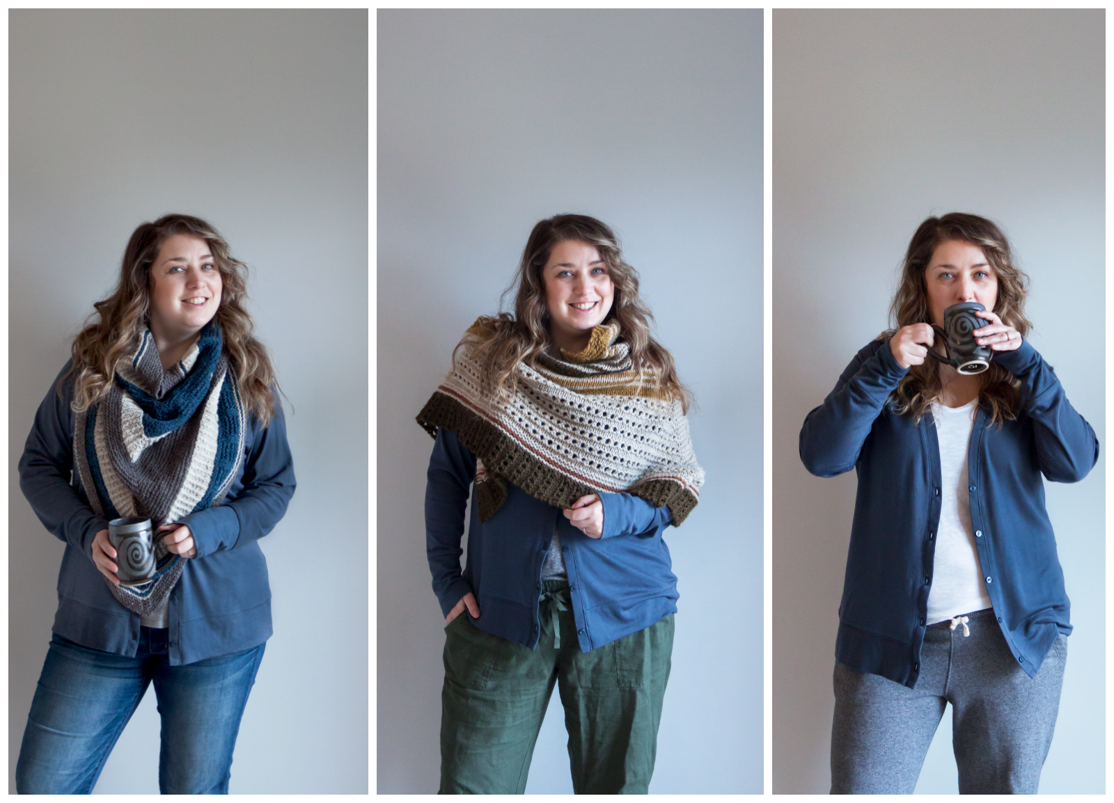 Here's a few different outfits that I've been wearing my Phinney Ridge Cardigan with right now - a pair of jeans with a light tank, favourite jogging pants and linen pants with a comfy tee. Shown with my BRADWAY Shawl and my HUDSON shawl.