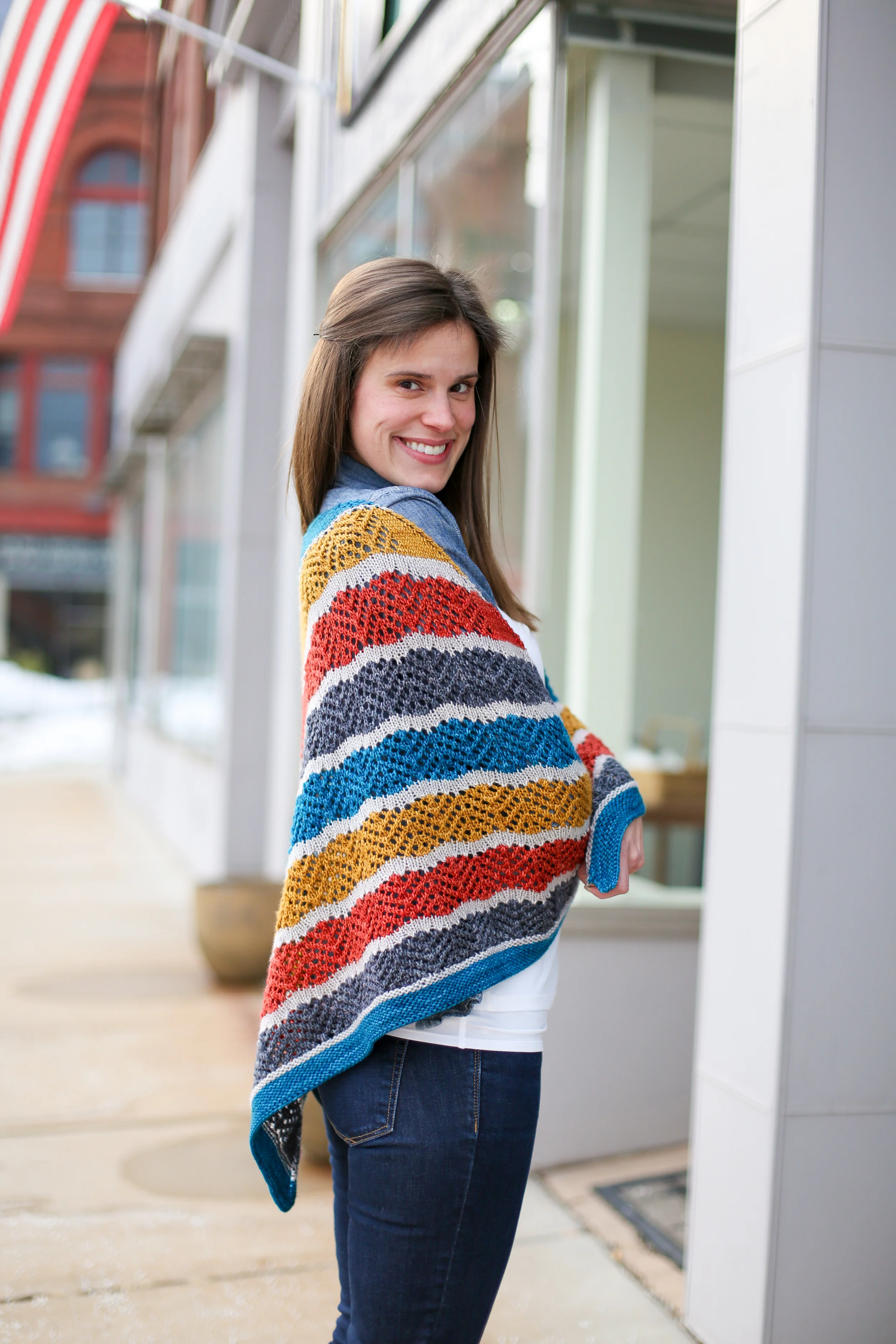 Color changes and pretty lace stitches paired with Stockinette stitch create an eyecatching triangular shawl. Inspired by Lorelai from the tv show Gilmore Girls - this shawl is filled with personality! So have fun & pick a color palette that shows off your personality!